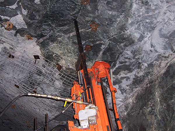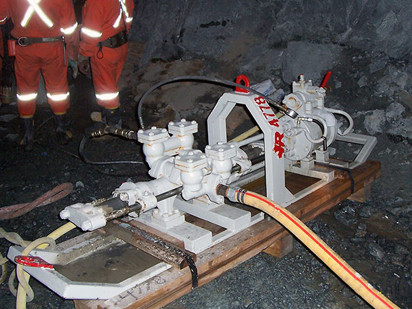 After assessing site conditions, Peter worked with contractor personnel to rig a rock bolt jumbo to mechanically install an inflatable borehole packer within the flowing diamond drill hole. This packer installation procedure was successfully accomplished using the drill jumbo without exposing any personnel to hazards associated with working directly beneath a high volume, cold water inflow.