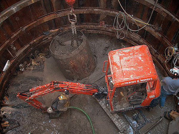 Working from within the shaft, grouting engineer Peter White and his technical crew commenced chemical grouting operations at the highest point along the rock-sheet pile interface using water-activated polyurethane resin and systematically stabilized soil conditions around the perimeter of the shaft to prevent soil or water from infiltrating.