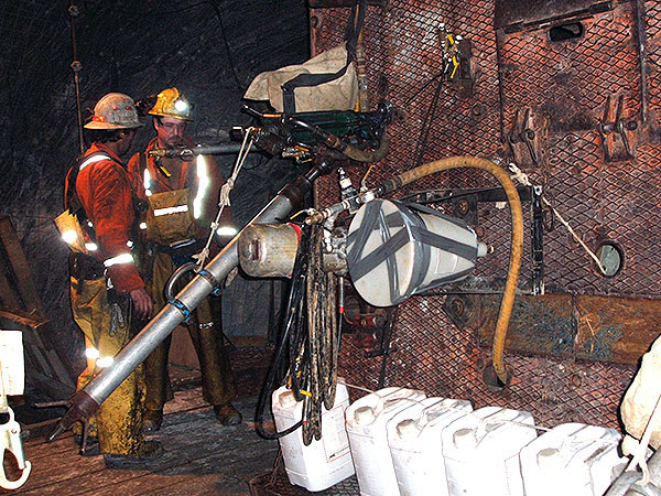 An initial stage of chemical grouting was undertaken to stop the initial high-volume water inflow. After drilling shallow probe holes into the water flow path, chemical grout and pumping equipment were moved to the top of the raise using the Alimak climber.