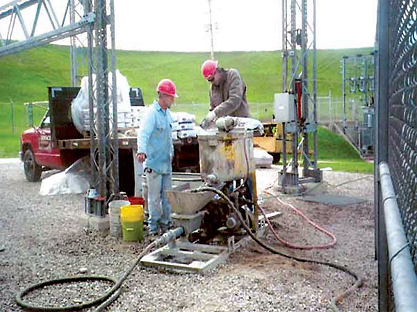 Crew preparing grout setup